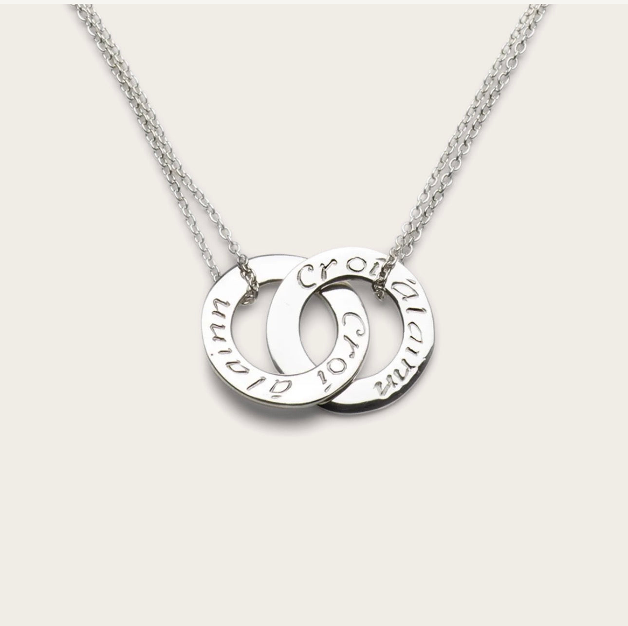 The silver circles interlink and are balanced by a double silver chain. Can be worn at 16” or 18” due to a very handy extension chain. This Gaelic inscription means A beautiful heart.