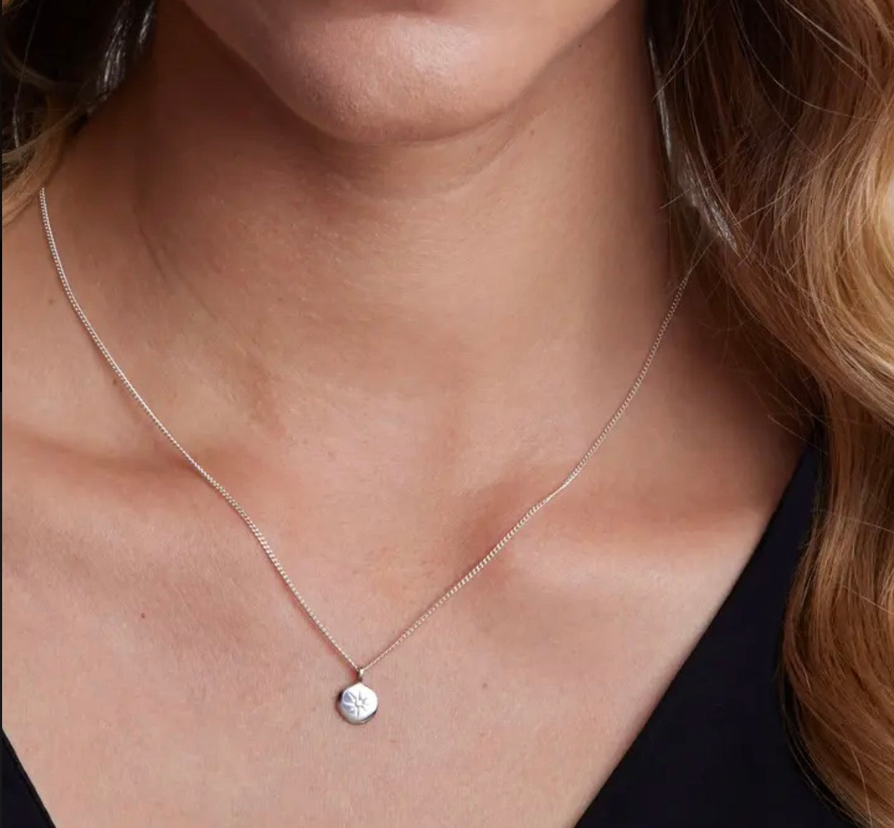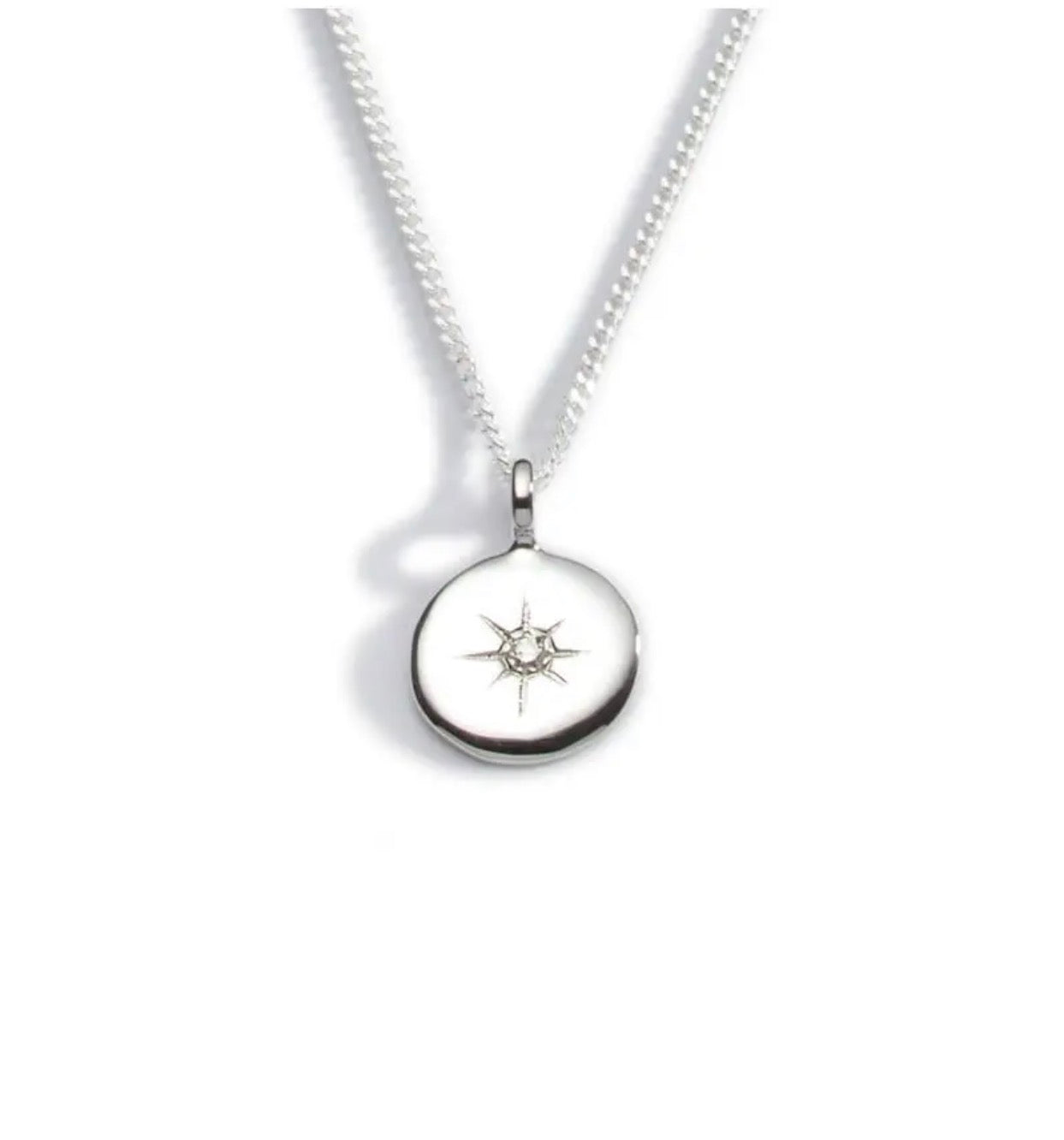 This charming silver pendant features a diamond-set disc with the Gaelic inscription "Las mo shlí" ("Light my way") on the reverse. It hangs from a delicate, extendable silver chain. Crafted in the Enibas studio in Schull, West Cork.