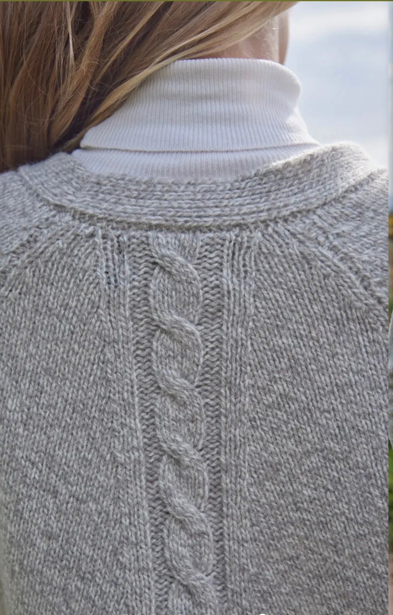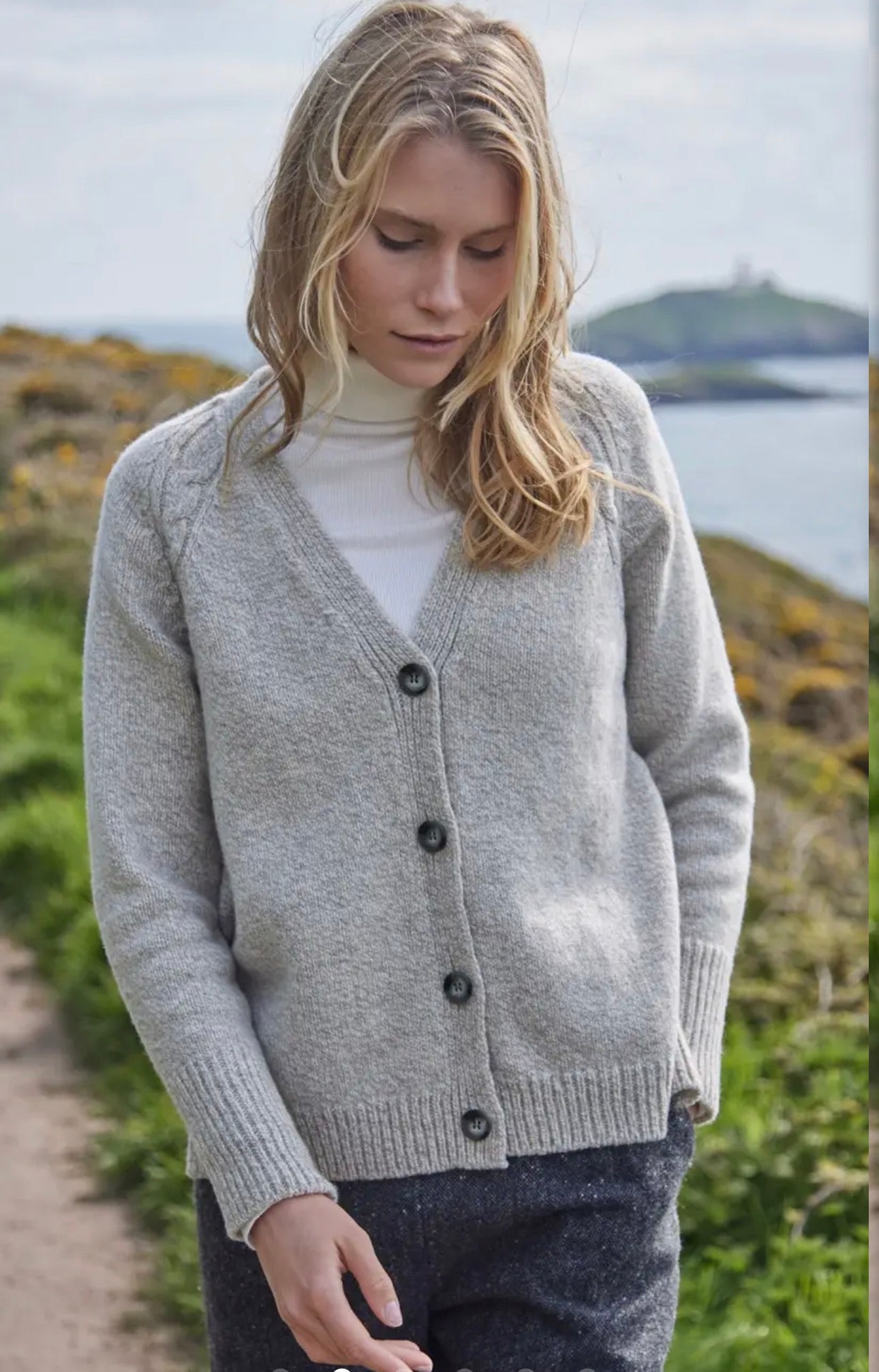 This relaxed style is a button front cardigan with a gentle moss and cable pattern and statement, cable lantern sleeves. This style is designed to be a relaxed fit and the sleeves are designed to be long and generous. We recommend sizing down for a more fitted look.