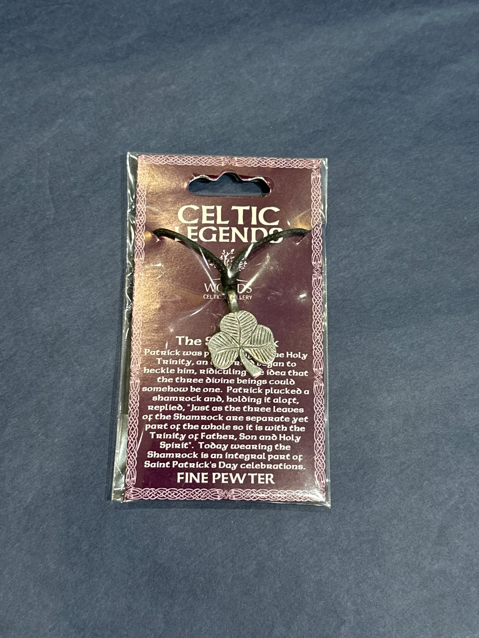 Pewter Celtic Chokers on black adjustable full length cord in Shamrock design. Legend: The Shamrock is a three leaved clover that grows in Ireland. It is said that while Patrick was preaching an open-air sermon on the Holy Trinity, and an old Druid began to heckle him, ridiculing the idea that the three divine beings could somehow be one. Patrick plucked a shamrock and, holding it aloft, replied, "Just as the three leaves of the shamrock are separate yet part of the whole so it is with the Trinity of the Father, Son and Holy Spirit." Today wearing the shamrock is an integral part of St. Patrick's Day celebrations.
